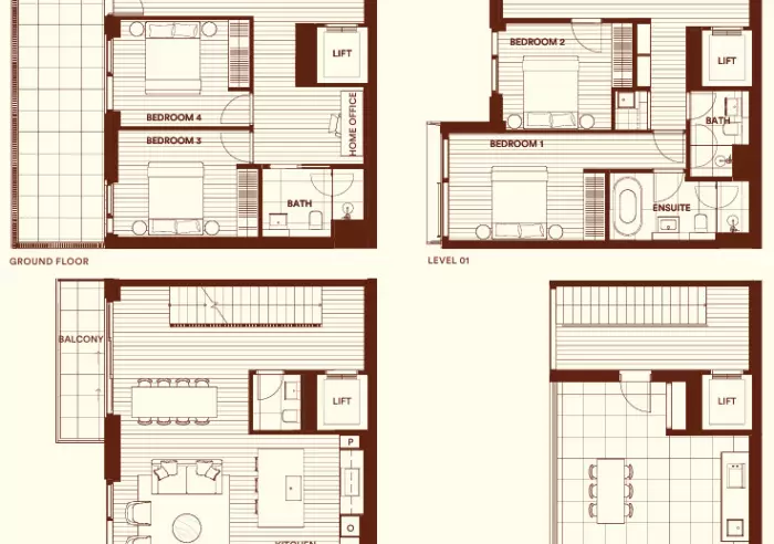 Spanning multiple levels, each townhome boasts generous open-plan living areas, private study spaces, and house-sized kitchens appointed with Miele appliances, monolithic stone, and bespoke joinery. Bedrooms are sanctuaries of calm, with the master suite featuring a walk-in robe and spa-like ensuite. With three full bathrooms plus a powder room, these homes are ideal for families or those who love to entertain.